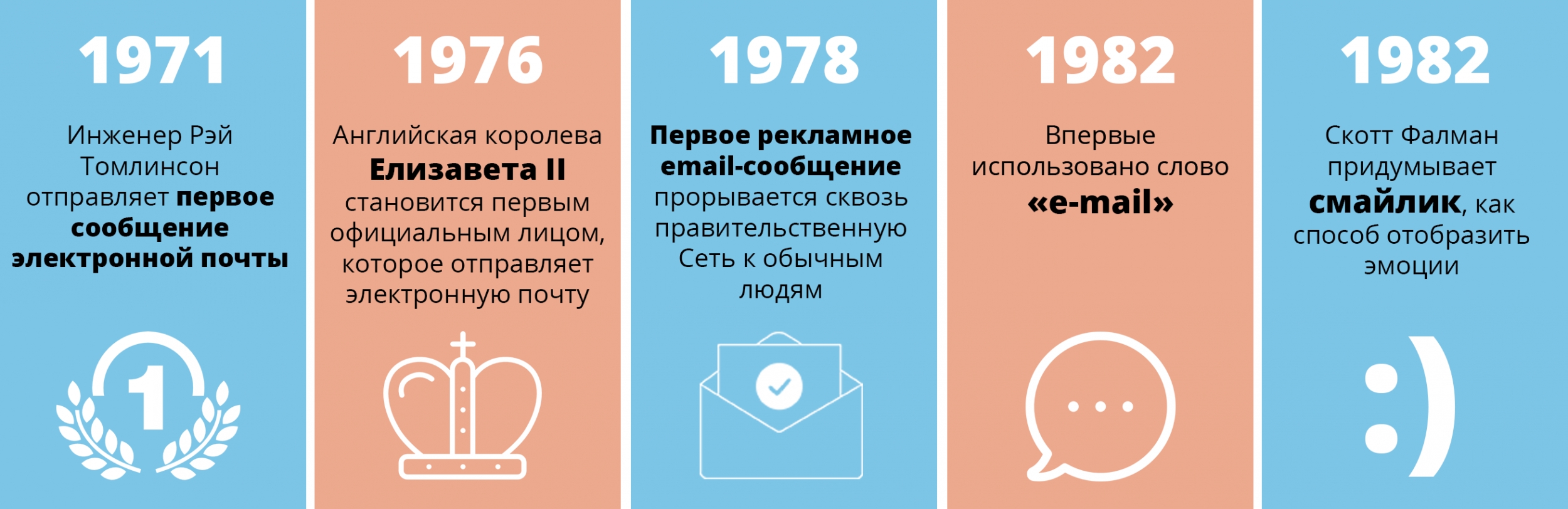 Позже, через пять лет после того, как была изобретена электронная почта, королева Елизавета II стала первой главой государства, которая отправила email, а всего два года спустя, впервые по электронной почте было разослано рекламное сообщение по сети государственных и университетских компьютеров. В 1982 году было впервые использовано слово e-mail, и в том же году Фалманом был изобретен первый смайлик, который отображает эмоции, проложив путь для широкого спектра смайликов, используемых в цифровой форме каждый день. Сейчас цифровые смайлики из символов перешли на новый уровень и представляют собой графические изображения emoji.
