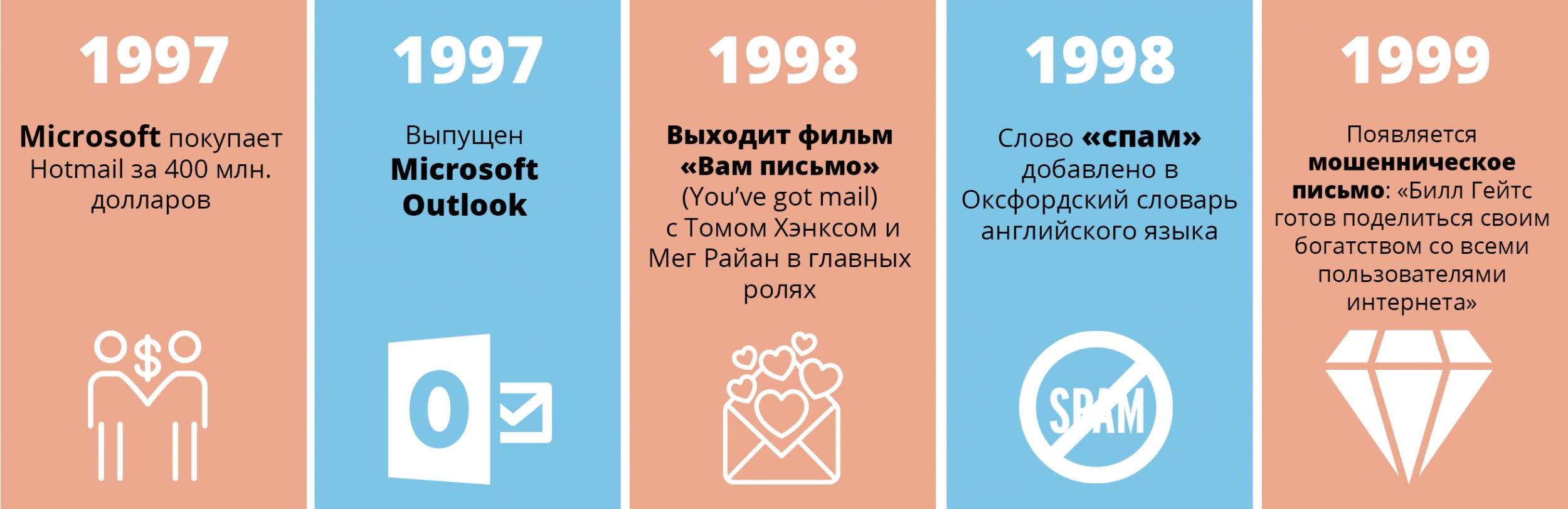1997 год был важным для Microsoft. Компания покупает Hotmail примерно за 400 миллионов долларов и выпускает знаменитый Microsoft Outlook. В 1998 году на экраны выходит фильм Вам письмо (You’ve got mail), заработав более 250 миллионов долларов в мировом прокате. В главных ролях снялись голливудские звезды первой величины – Том Хэнкс и Мэг Райан. Сама же картина получила номинацию на Золотой глобус. В том же году Оксфордский словарь английского языка пополняется словом спам.