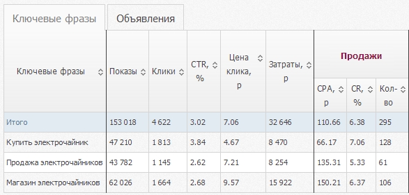 Видно, что только первое ключевое слово имеет CPA, не превышающий наш средний в 100р. А два нижних имеют CPA, значение которого больше 100р. Увидев эти данные, вы можете провести оптимизацию CPA всей вашей кампании. Для этого нужно понизить ставку по двум невыгодным ключевым фраза, что приведет к снижению CPA по ним. А по ключевой фразе, которая имеет хороший CPA, ставку повысить. Это позволит вам собрать по ней больше кликов, а значит, больше продаж с выгодным CPA.