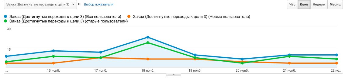 А все очень просто - пришла пачка старых клиентов, с конверсией в 4 раза большей, чем у остального трафика. И, так как их доля была существенной и весомой, они повлияли на конверсию положительно, чего нельзя было сказать о нашем апдейте. На рисунке ниже видно, что количество заказов от новых пользователей не сильно изменилось от внедренных изменений.