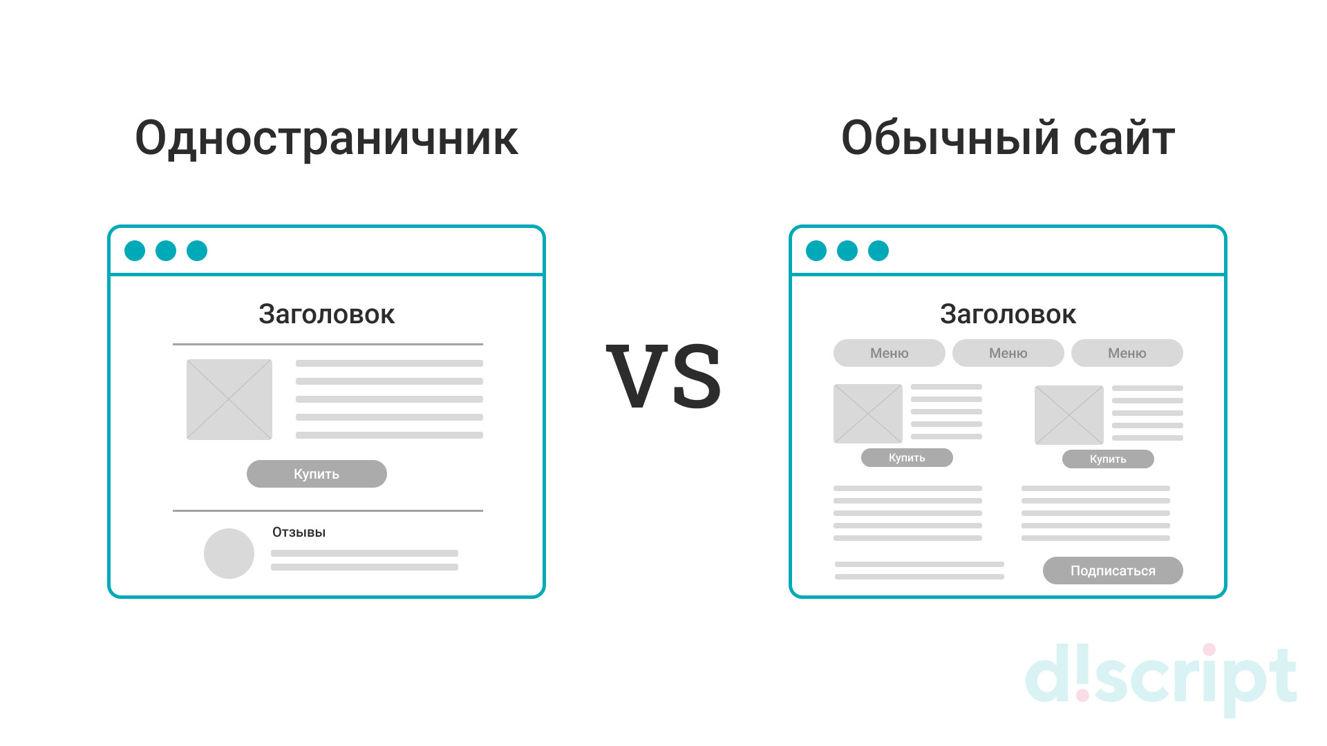 | Наличие навигации | Отсутствует, может быть в виде заякоренного меню, ведущего на разные части страницы | Присутствует в виде навигационного меню, ведущего на внутренние страницы сайта |