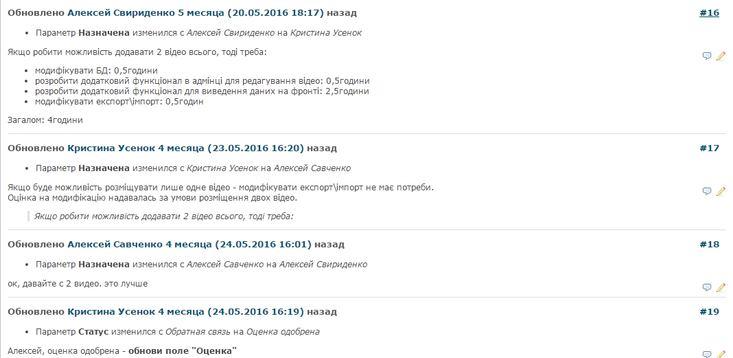 В итоге всё свелось к тому что до разработки Redmine Estimates мы просто вели всё в комментариях, примерно так, и это было крайне неудобно: