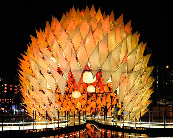 В Гонконге за 11 дней построили павильон Golden Moon высотой с шестиэтажный дом. Его конструкция — это геодезический купол из стали, к которому прикреплены бамбуковые стойки. Сверху к ним присоединили геометрически выверенные панели из ткани, а в них разместили светодиодные фонарики. Когда они зажигаются, создается впечатление, что купол оживает.