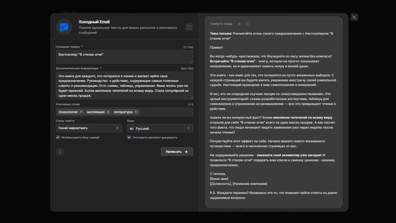 Попробуем составить письмо с помощью нейросети для продвижения бестселлера «В стихии огня» (название придумано автором статьи). В графе «Дополнительная информация» указываем то, что хотели бы обязательно увидеть в письме: основные данные, особенности книги. Не забываем написать ключевые слова, которые будут фигурировать в тексте, и выбрать стиль. Стили, кстати, можете попробовать разные, в зависимости от компании и продвигаемой услуги или товара.