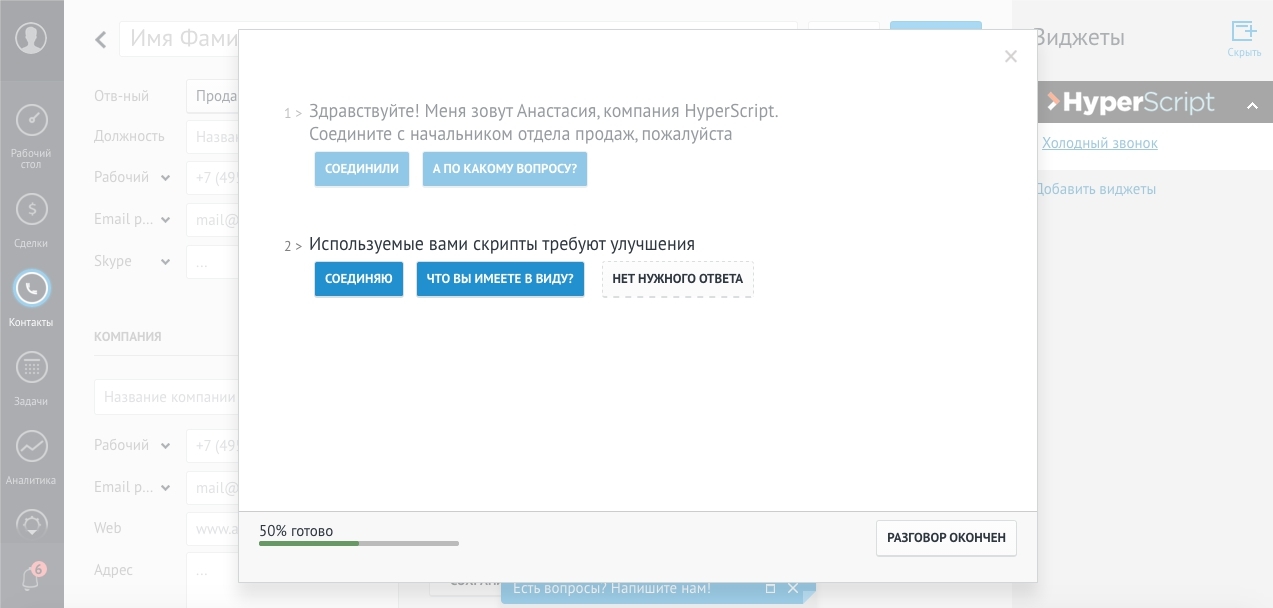 Теперь вы можете сконструировать скрипт для менеджеров в HyperScript, и он тут же станет доступен для прохождения не только в сервисе, но и через виджет HyperScript для amoCRM.