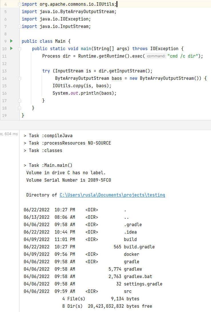 Метод exec() позволяет вызвать любую системную утилиту, получить результат в виде байтового потока и анализировать его любыми способами. Как пользоваться, показано ниже на примере простого вызова команды dir.