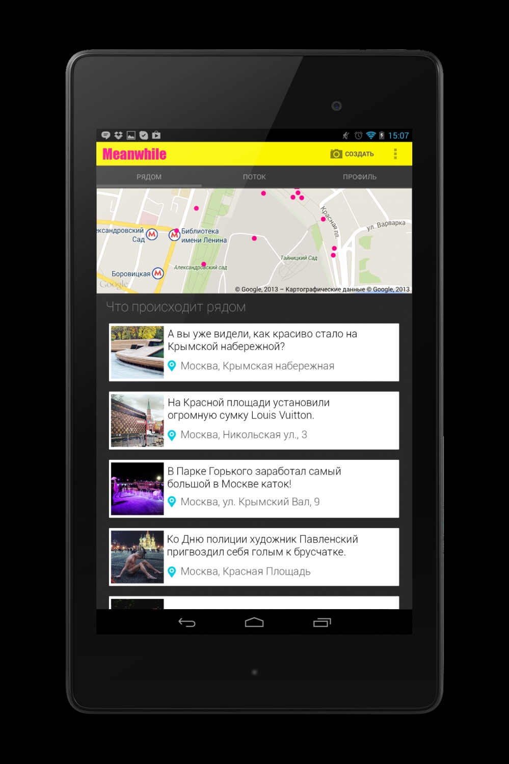 Мы обновили Meanwhile до версии 2.3.1. Был полностью переделан таб "Рядом". Теперь вы будете видеть только самые актуальные и интересные события и новости, которые происходят рядом с вами прямо сейчас.