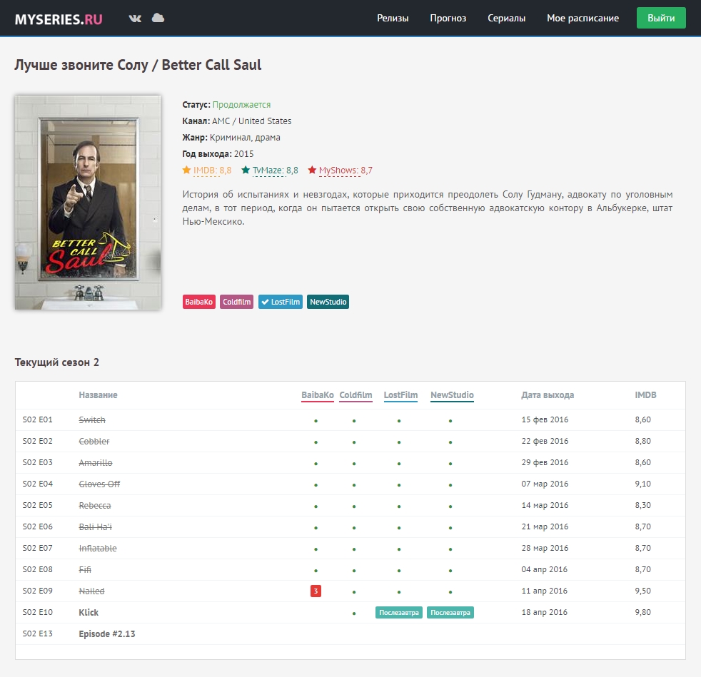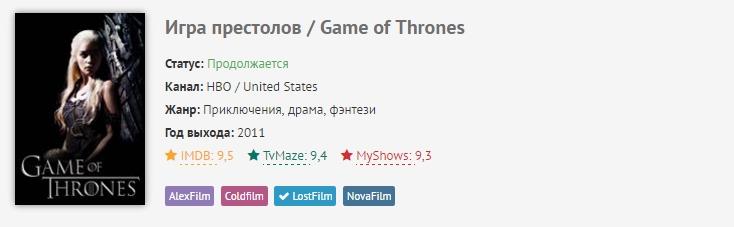 Данный раздел так же претерпел изменения. На странице сериала теперь отображается только последний сезон сериала который выходит в данный момент (или недавно завершился). Изменился способ индикации статуса релиза - вышедшие релизы отображаются в виде зеленой точки, а для будущих релизов отображается ожидаемая дата выхода: