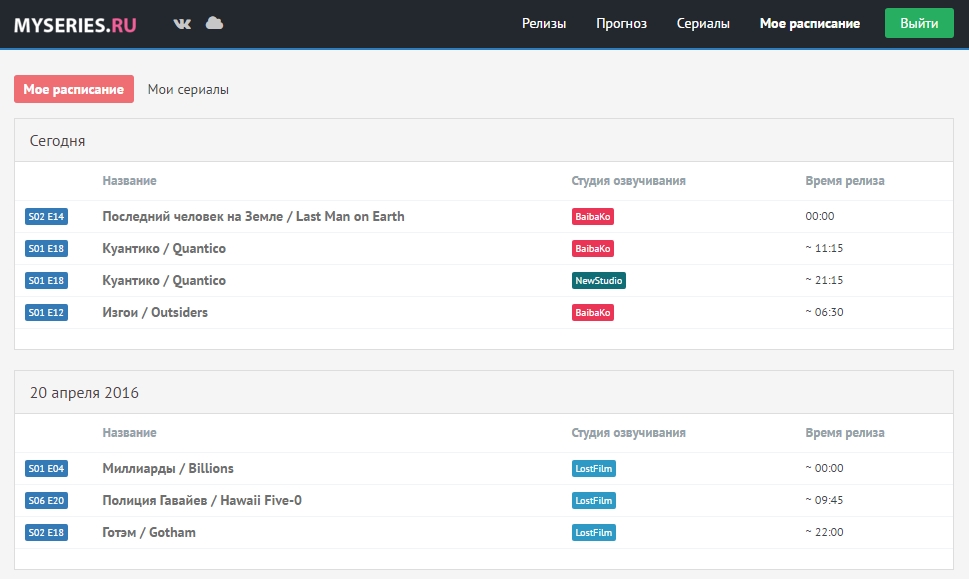 Создание пользовательского списка сериалов приводит нас к еще одному нововведению - пользовательскому расписанию. Теперь пользователь видит расписание лишь интересных ему сериалов. На одной страницы отображаются уже вышедшие ранее релизы и приблизительный прогноз на последующие дни: