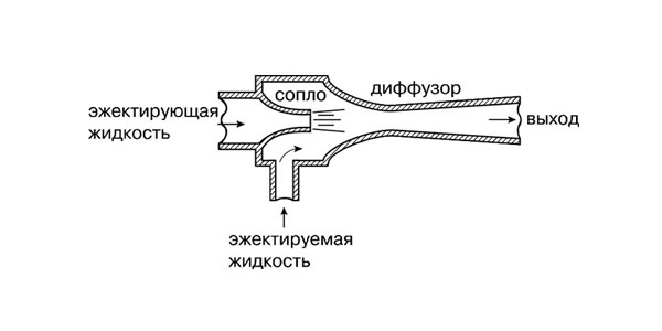 Работа эжекторного насоса основана на принципе Бернулли. Упрощая, его можно сформулировать так: давление течения с меньшей скоростью движения выше, а с высокой, наоборот, ниже. То есть поток с высоким давлением в трубе вызывает всасывание потока в патрубке с низким.