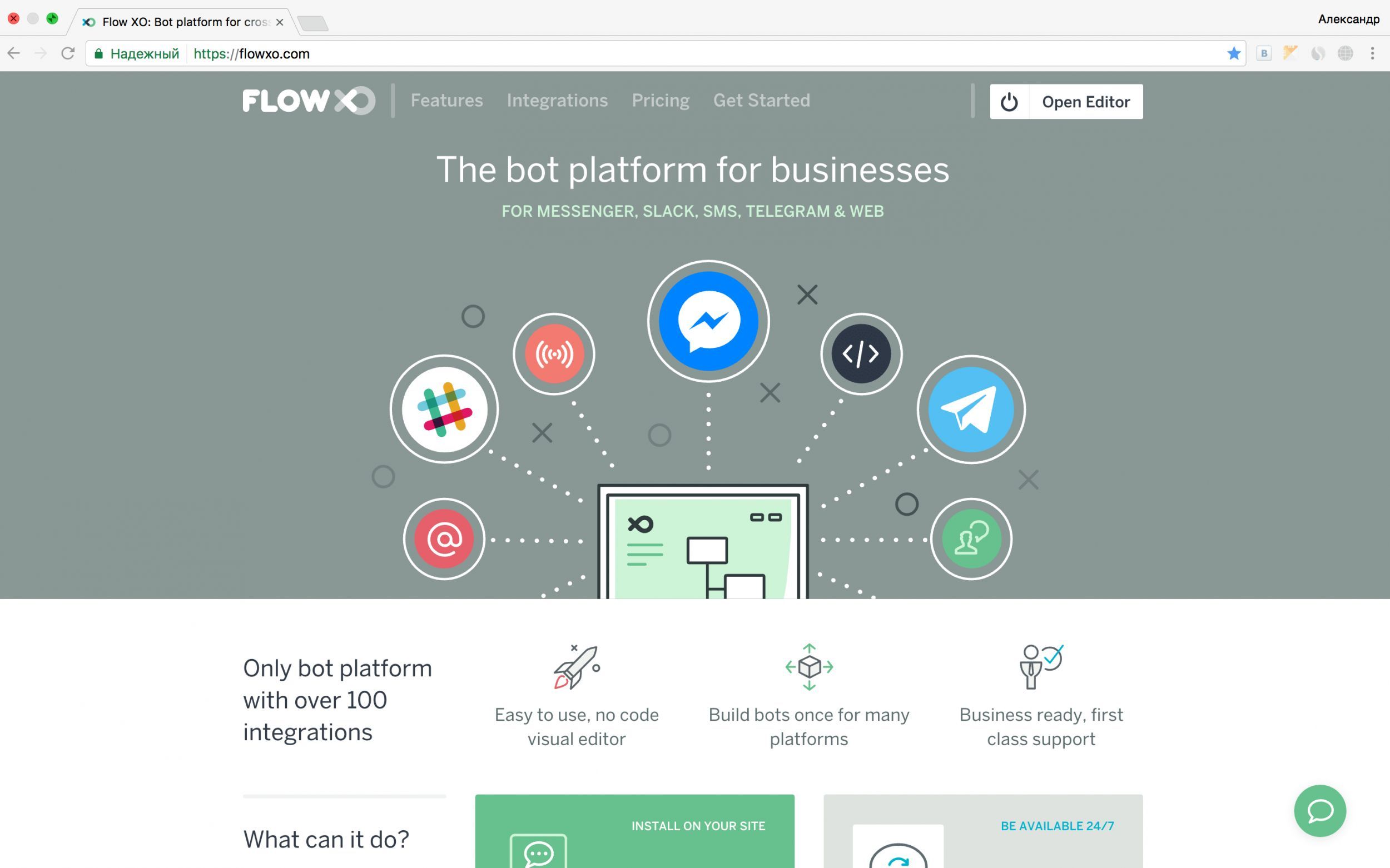 XO flow — мощное кросс-платформенное решение для создания ботов без навыков программирования. Интуитивно понятный интерфейс редактора позволяет в считанные минуты настроить логику будущего бота. К ключевым преимуществам можно так же отнести огромное количество встроенных интеграций (более 90) со всевозможными внешними сервисами.