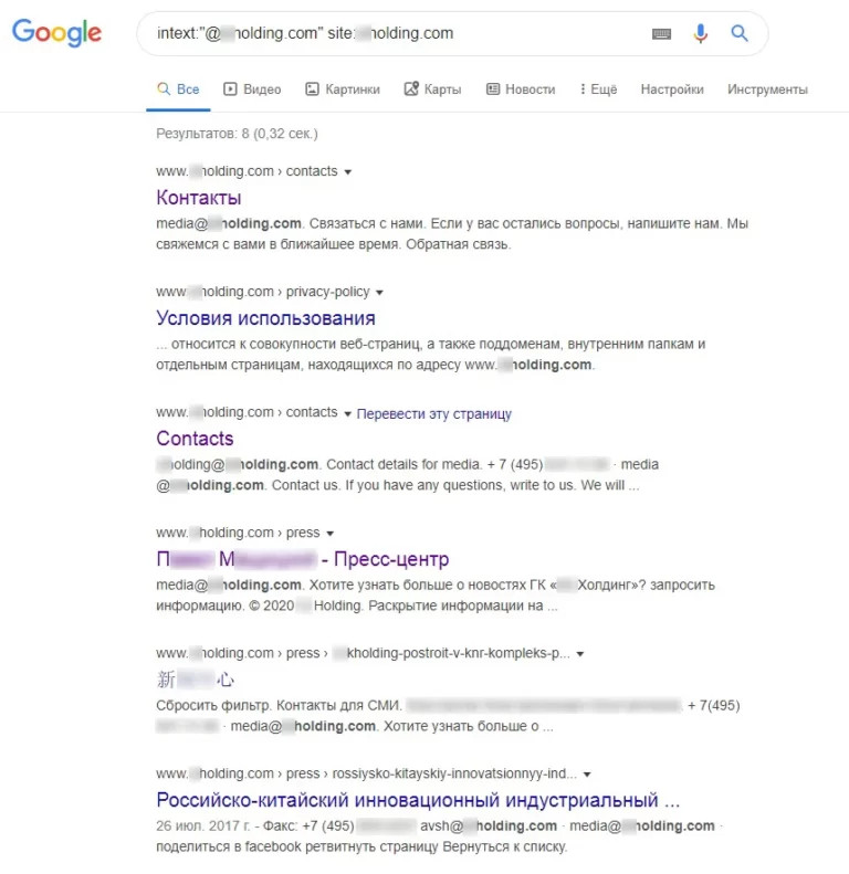 Обычно почтовые адреса расположены в том же домене, что и остальные ресурсы компании. Для начала посмотрим, какие адреса можно обнаружить в открытом доступе на сайте целевой организации: