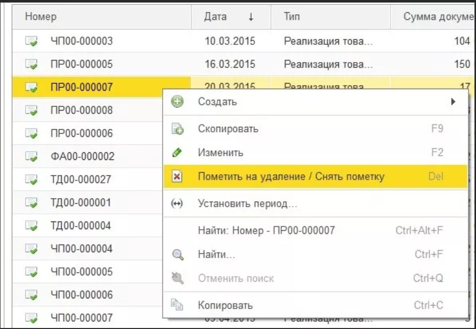 Чтобы объект стал помеченным на удаление с последующей возможностью его удалить, необходимо выбрать этот объект, нажав на него левой кнопкой мыши, и далее нажатием правой кнопки мыши в вызванном меню выбрать «Пометить на удаление/Снять пометку» (см. рис. 1)