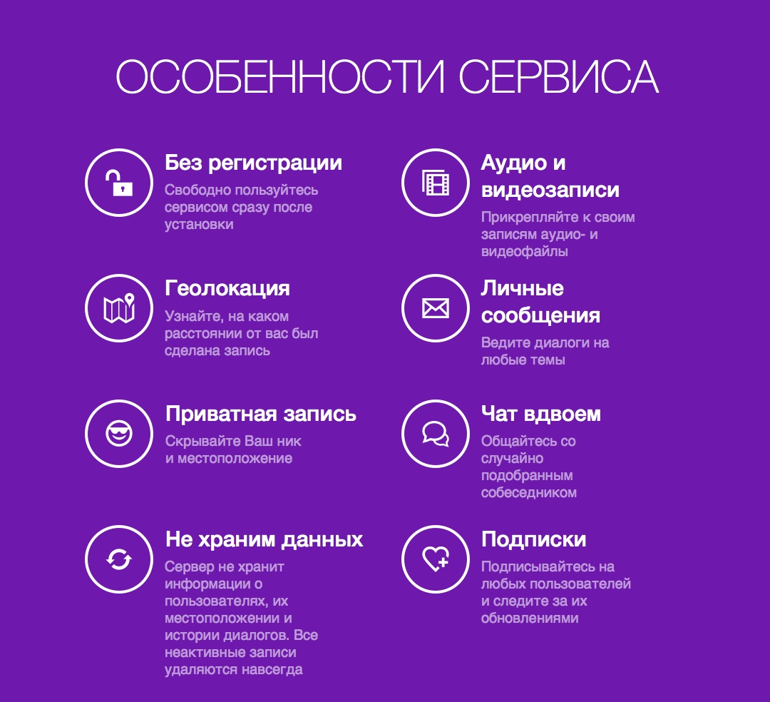 Plum не запрашивает никаких личных данных. Пользоваться сервисом вы начинаете сразу после скачивания приложения. Анонимно делитесь своими фотографиями, картинками, текстовыми сообщениями, аудио- и видеозаписями. С помощью Plum вы можете писать сообщения абсолютно незнакомым вам людям, подписываться на них и комментировать их записи. Функция Приватная запись дает возможность скрывать свои ник и местоположение. Вы можете легко начать общение со случайным человеком с помощью функции Чат вдвоем.
