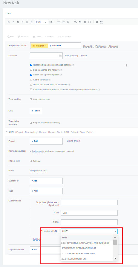 Работая в крупной компании с множеством подотделов, наш клиент пришёл к определённому сценарию, а именно: любая поставленная задача на портале должна быть под чьим-то крылом. Даже если сотрудник ставит себе личную задачу — технически, она должна прикрепляться к определённому отделу (юниту).