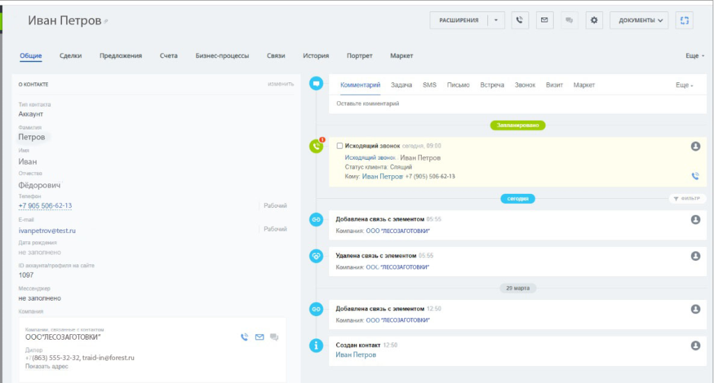 Профиль физического лица тоже Контакт, причём в данной сущности создано поле, которое имеет ссылку на другой контакт, а юридичские лица и ИП — это Компании. Связка контактов и компании осталась стандартной.