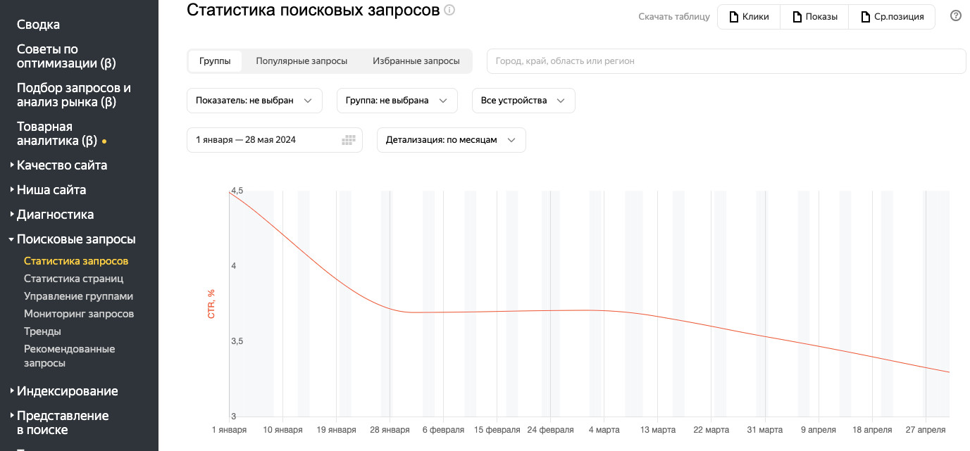 Экспериментировать со сниппетами и отслеживать показатель %CTR можно с помощью инструмента Статистика запросов в Яндекс Вебмастере.