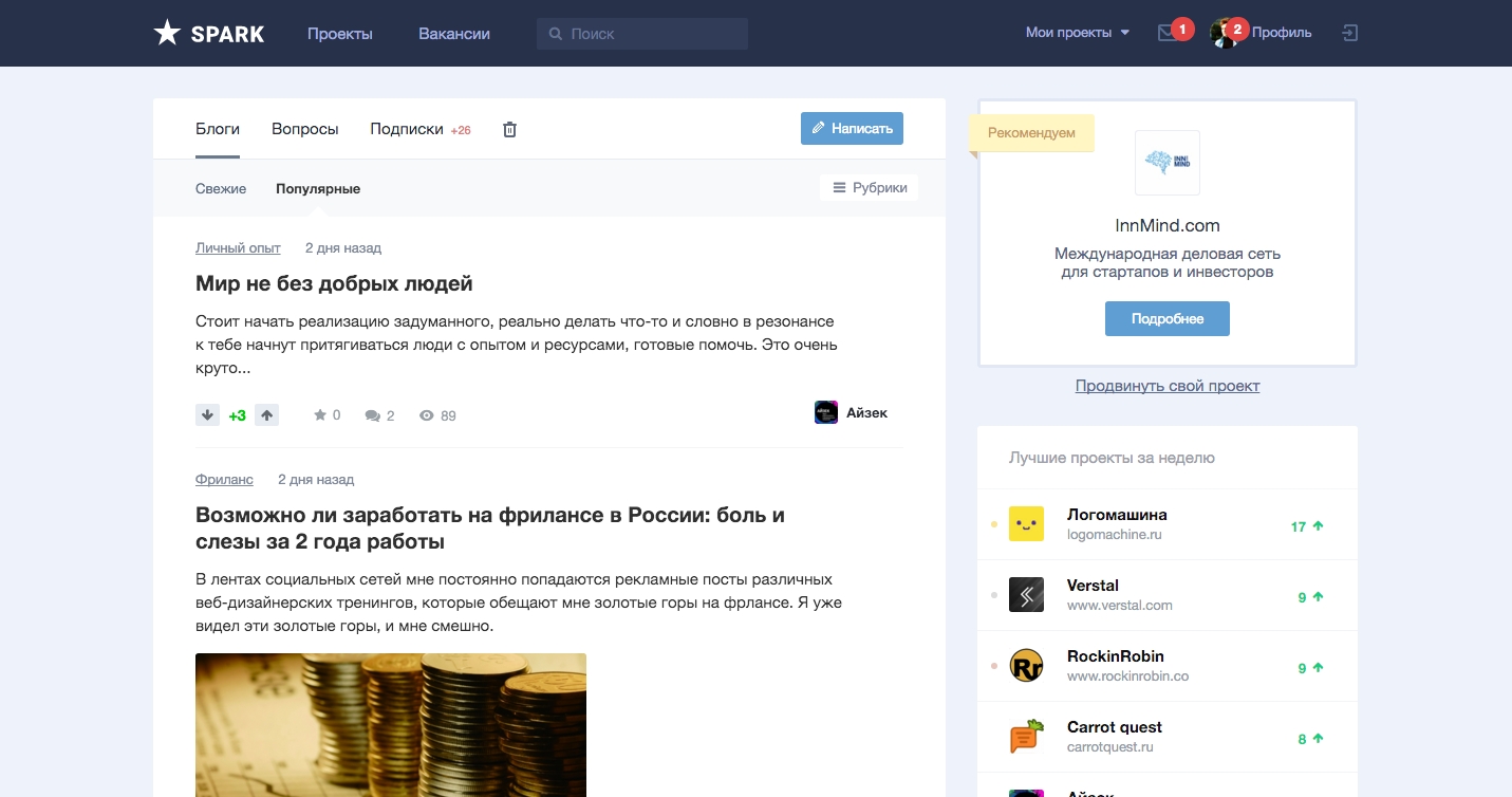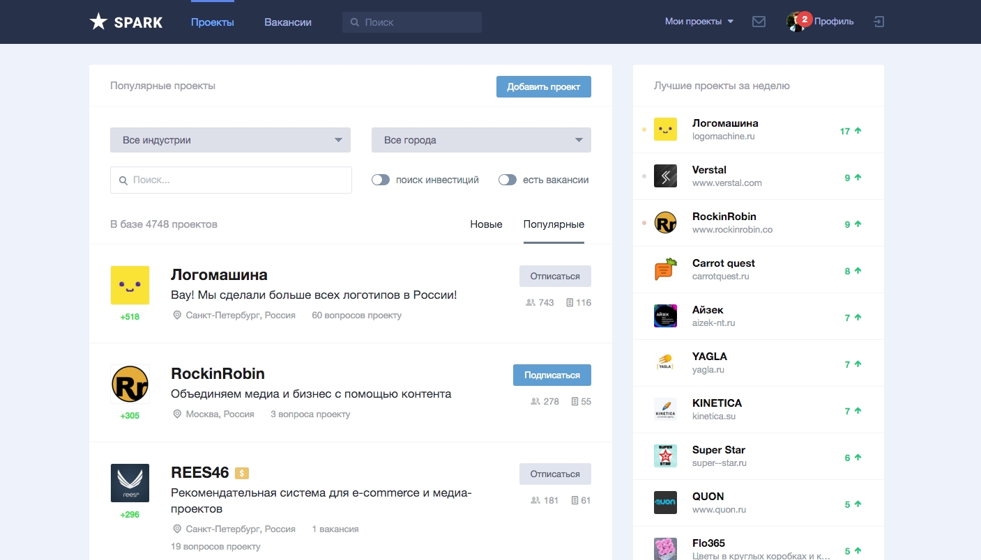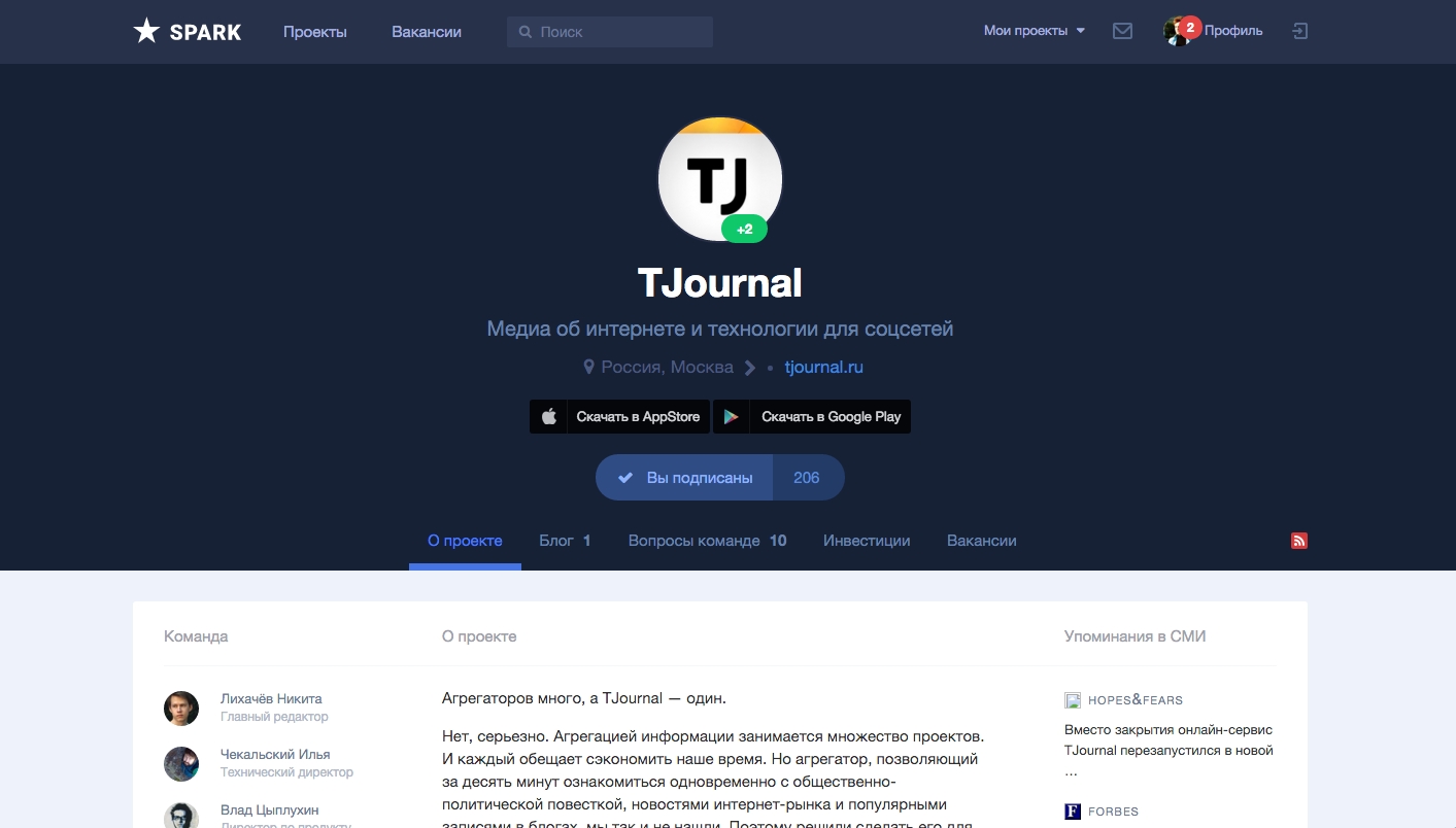 Это полноценное представительство проекта c подробным описанием, командой, блогом, вакансиями и сведениями об инвестициях. Записи из блога попадают на главную страницу Спарка, что позволяет привлечь дополнительное внимание к проекту.