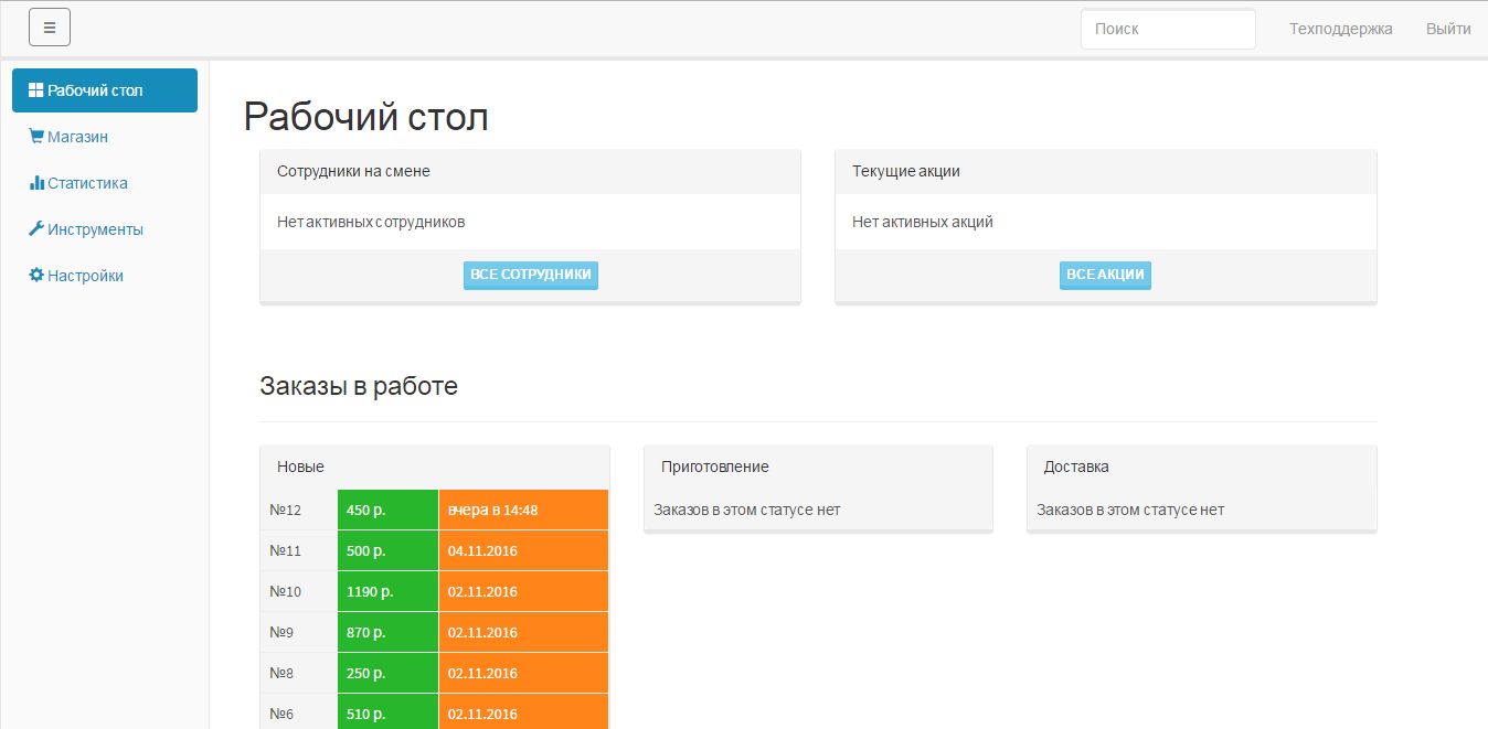 - CRM-система (отдельные кабинеты администратора, повара и курьера; выставление задач; доска заказов; контроль местоположения курьеров и многое другое);