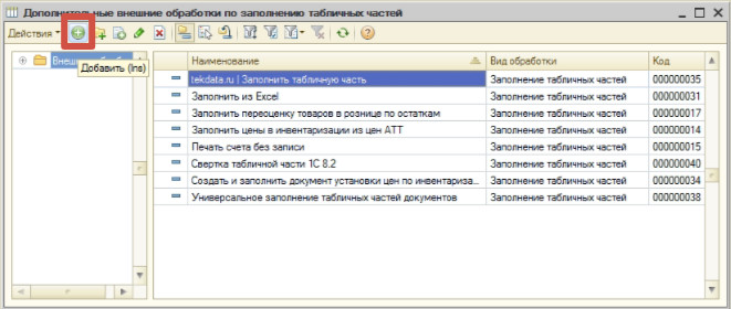обработки по заполнению табличных частей нажимаем кнопку Добавить и