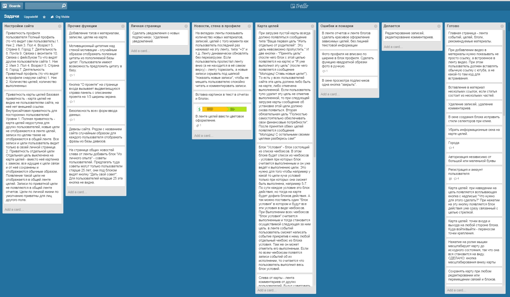А вот так выглядит наша доска с задачами по сайту в трелло