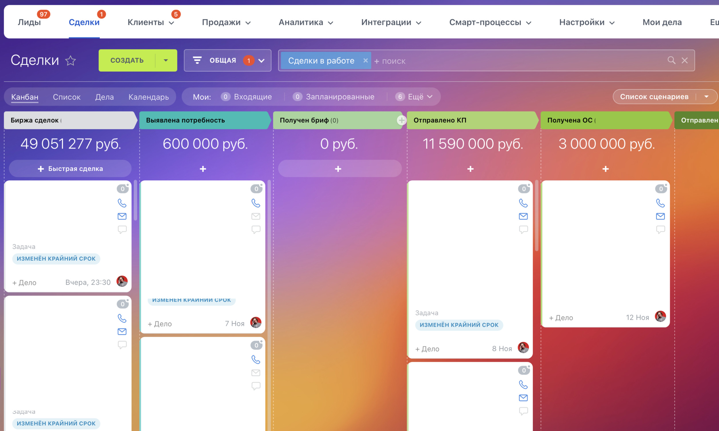 Основной инструмент — Битрикс. Мы с ним женаты уже лет 5, а то и больше. Настроили Канбан доску под себя, воронку продаж, небольшую автоматизацию и живем счастливо.