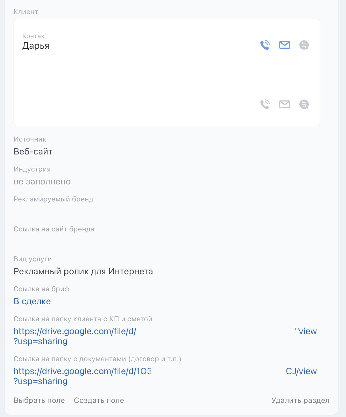 Внутри карточек отдельный чат по каждому клиенту и поля с основными ссылками по материалам (бриф, кп и т.п.). Туда же подгружаются имейлы по этому клиенту, заметки менеджеров, задачи на команду (просчет смет, написание креатива и т.д.).